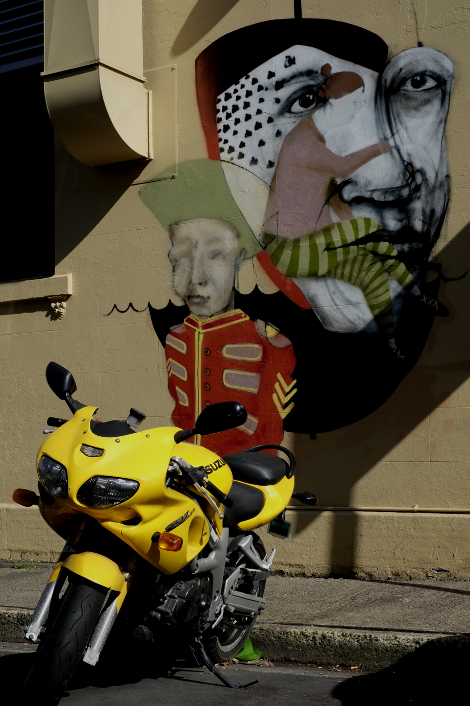 Im Folgenden, von links nach rechts: Guidos Terrasse, sein Ausblick, Guidos Strasse, Guidos Haus (ganz praktisch ... mit Café im Erdgeschoß), Guidos Park, die Nachbarschaft um den Park herum, schließlich das Treiben in und um die King Street um 8 Uhr morgens. (die letzten Bilder zeigen übrigens ein Kunstwerk: die „Tarnmaske“ auf dem Mauersockel ist aus Beton gegossen)