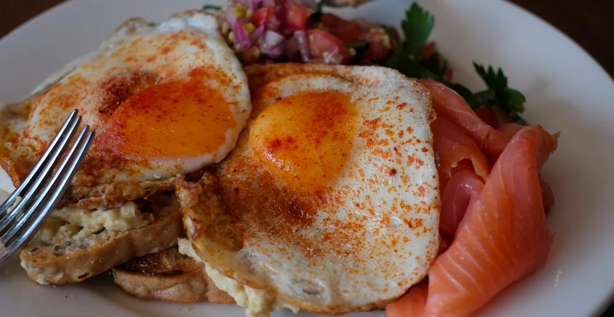 Jetzt, wo ich die kulinarische Talsohle Valparaiso überlebt habe, wollte ich mal wieder was richtig leckeres Essen, das auch gesund ist. Gehe also Frühstücken ins 2042, King Street. Es gibt Spiegeleier mit geräuchertem Lachs und gehacktem Kräuter-Tomatensalat, darunter versteckt sich glutenfreies Brot mit Humus bestrichen. Respekt, das schmeckt.