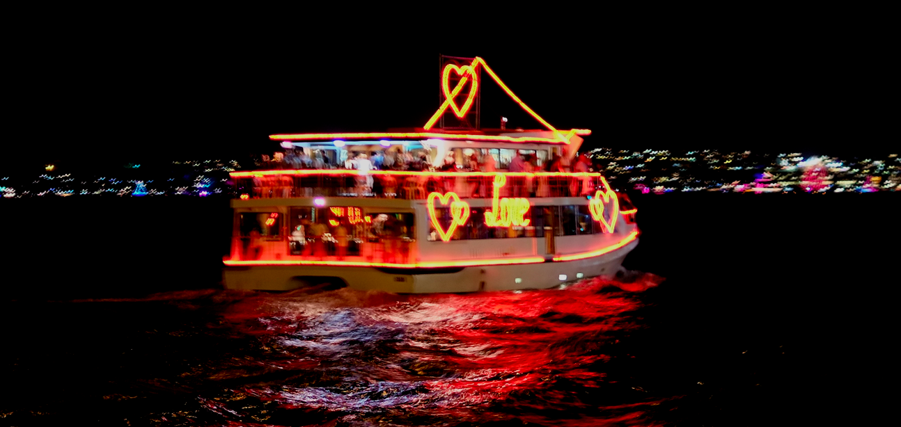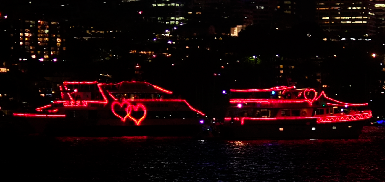 Die ersten Warnschüsse werden um 9 abgefeuert. Dann folgt so eine Art „illuminated Loveparade“ der Schiffe im Hafen.