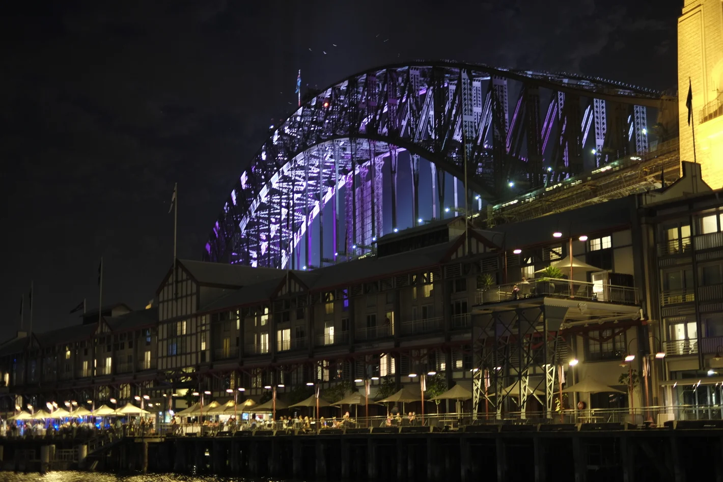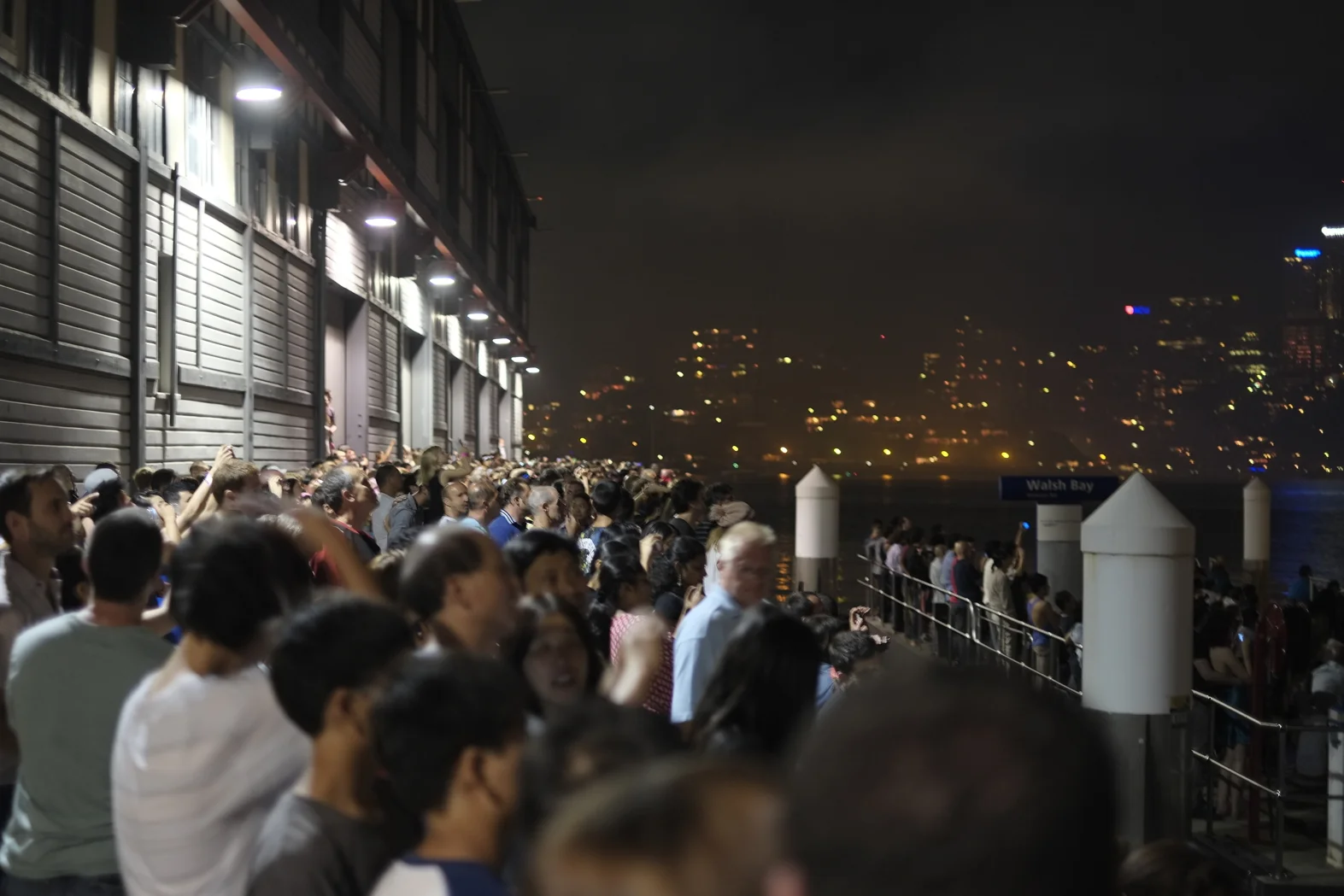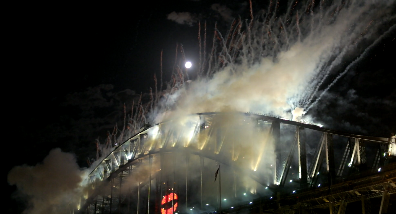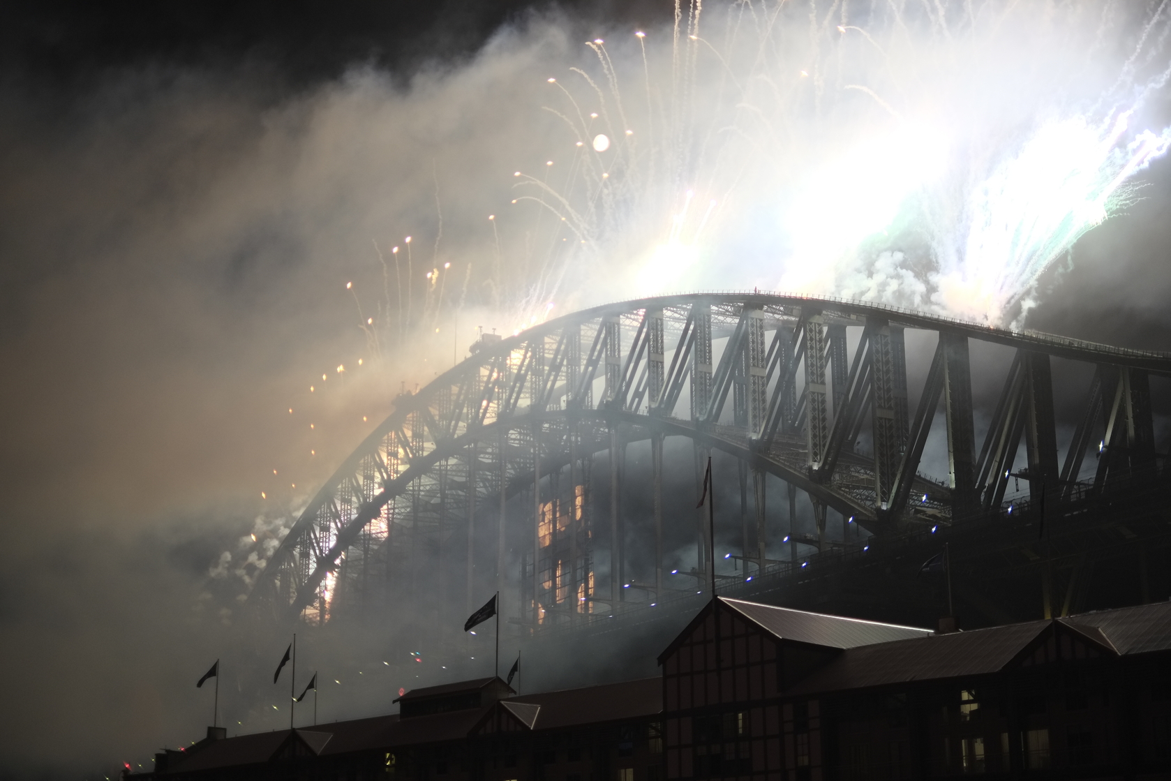 Spätestens um 10 wird es langweilig. Dann irrt man ein wenig umher, guckt anderen müden Leuten zu, sucht vielleicht einen gemütlicheren Platz. Ich bin schließlich hinter der Brücke gelandet. Man sieht von da aus zwar nur das Brückenfeuerwerk, und hat nicht den freien Blick aufs Wasser mit weiteren von Pontons betriebenen Feuerwerken, aber ich will ja auch nur einmal im Leben diese Brücke brennen sehen. Let's go ...