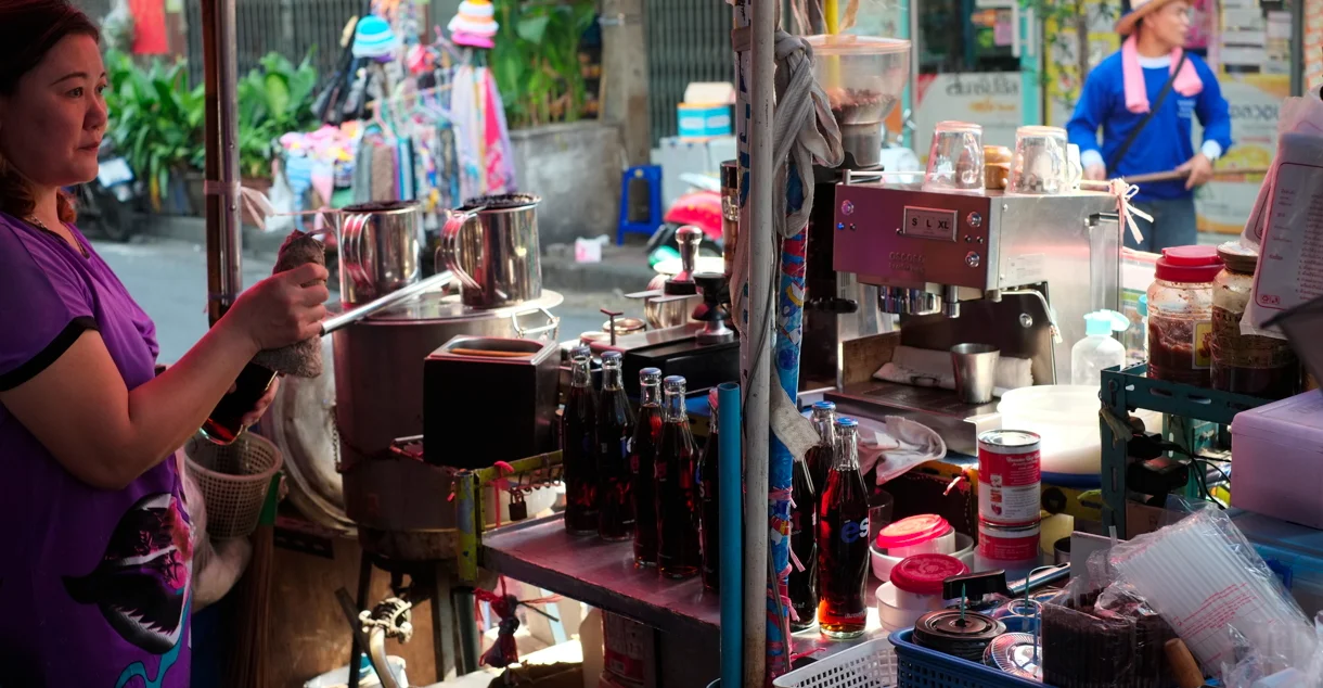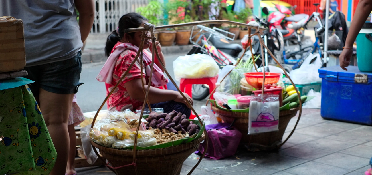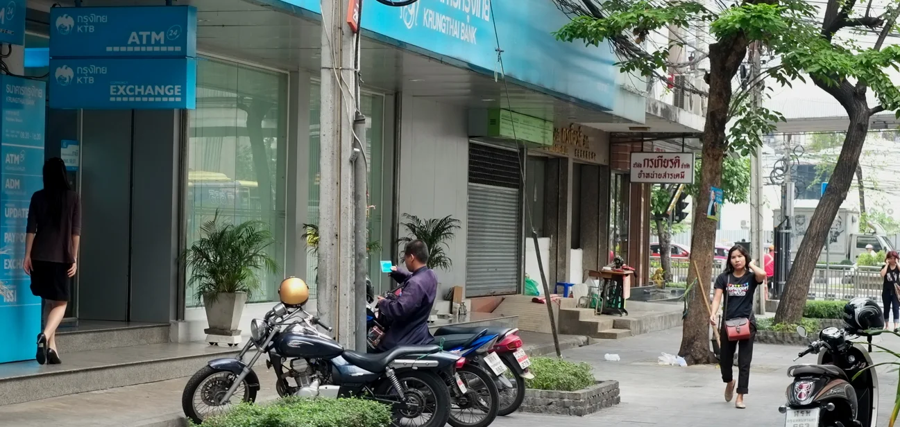 Die Strasse ist das Wohnzimmer hier, bisweilen sogar das Restaurant. Sterneküche auf der Gasse, das gibt es nur hier. Zubereitet von ganz normalen Leuten, die es anscheinend im Blut haben. Das größte Wunder sind für mich die mobilen Strassenrestaurants, die immer erst am Abend entstehen und nachts wieder komplett abgebaut werden. Im Folgenden unser absolutes Lieblingsrestaurant an der Rachathewi-Haltestelle. Bei Tag nichts zu sehen davon, normaler Betrieb vor der Bank, abends dann die Verwandlung …