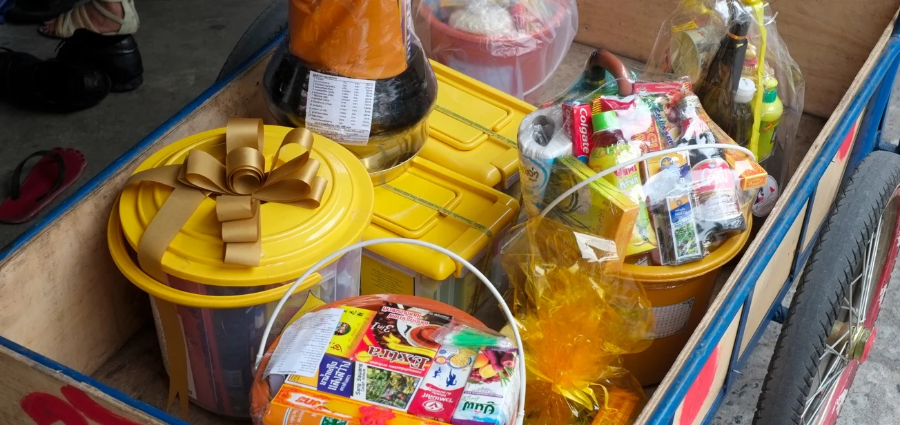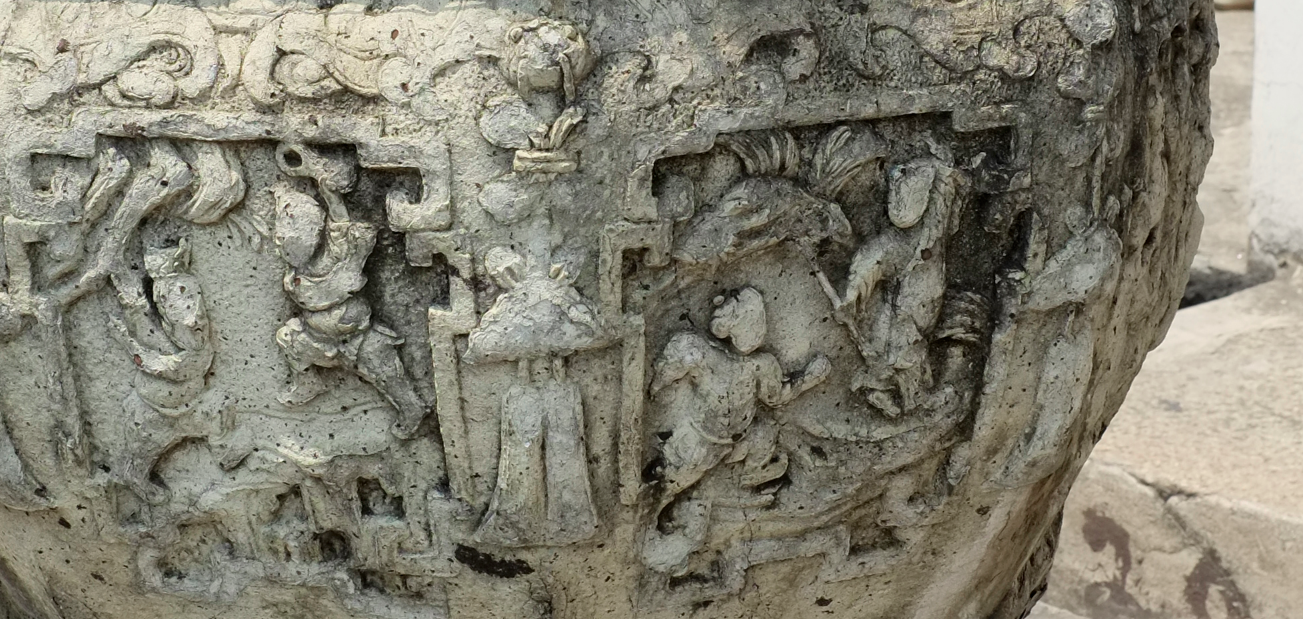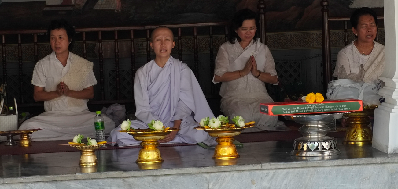 Wir fahren durch bis zur Endhaltestelle, die zu einer buddhistischen Tempelanlage führt. Den Jungs aus der Tempelschule scheint es nicht an guter Ernährung zu fehlen. Man kann eine Art Gebetsparcour abschreiten, jede Station ein kleines Ereignis.  Bei den heiligen Kühen sehe ich das schönste und das hässlichste Exemplar der Gattung auf einem Fleck nebeneinander verweilen. Kühe stehen für "Glück", das einem bei Gebet und Spende zukünftig widerfahren kann. Auf dem Leiterwagen werden die Gaben für die Toten gesammelt, auch im Jenseits soll es ihnen an nichts mangeln. Für einen weiteren kleinen Obolus erhält man von einem Mönch den Segen. Pen lacht mich ein wenig aus weil ich dachte, die kleinen Welse komme in die Suppe. Dabei kann man spenden und ihnen damit die Freiheit im Fluß erkaufen.