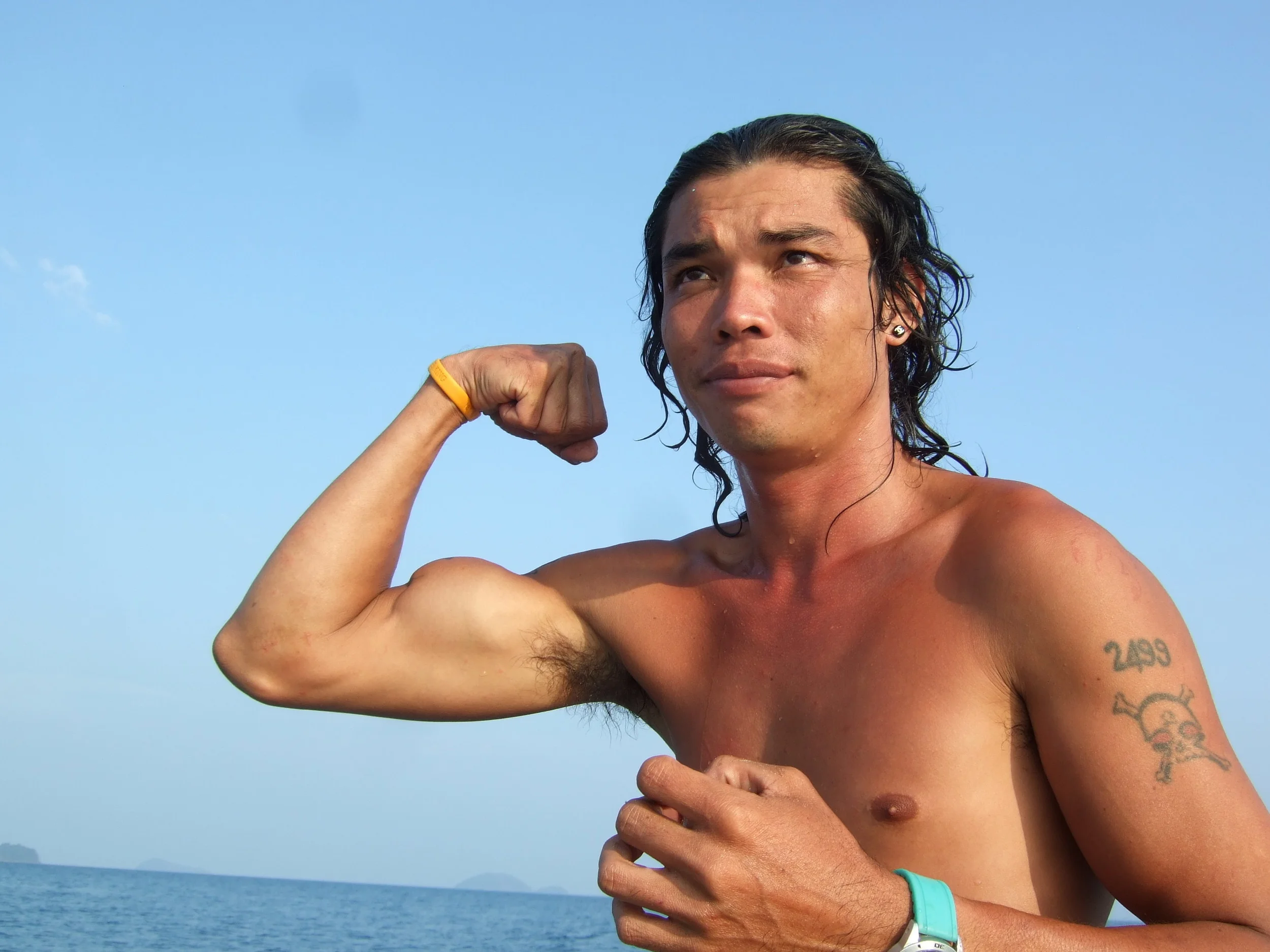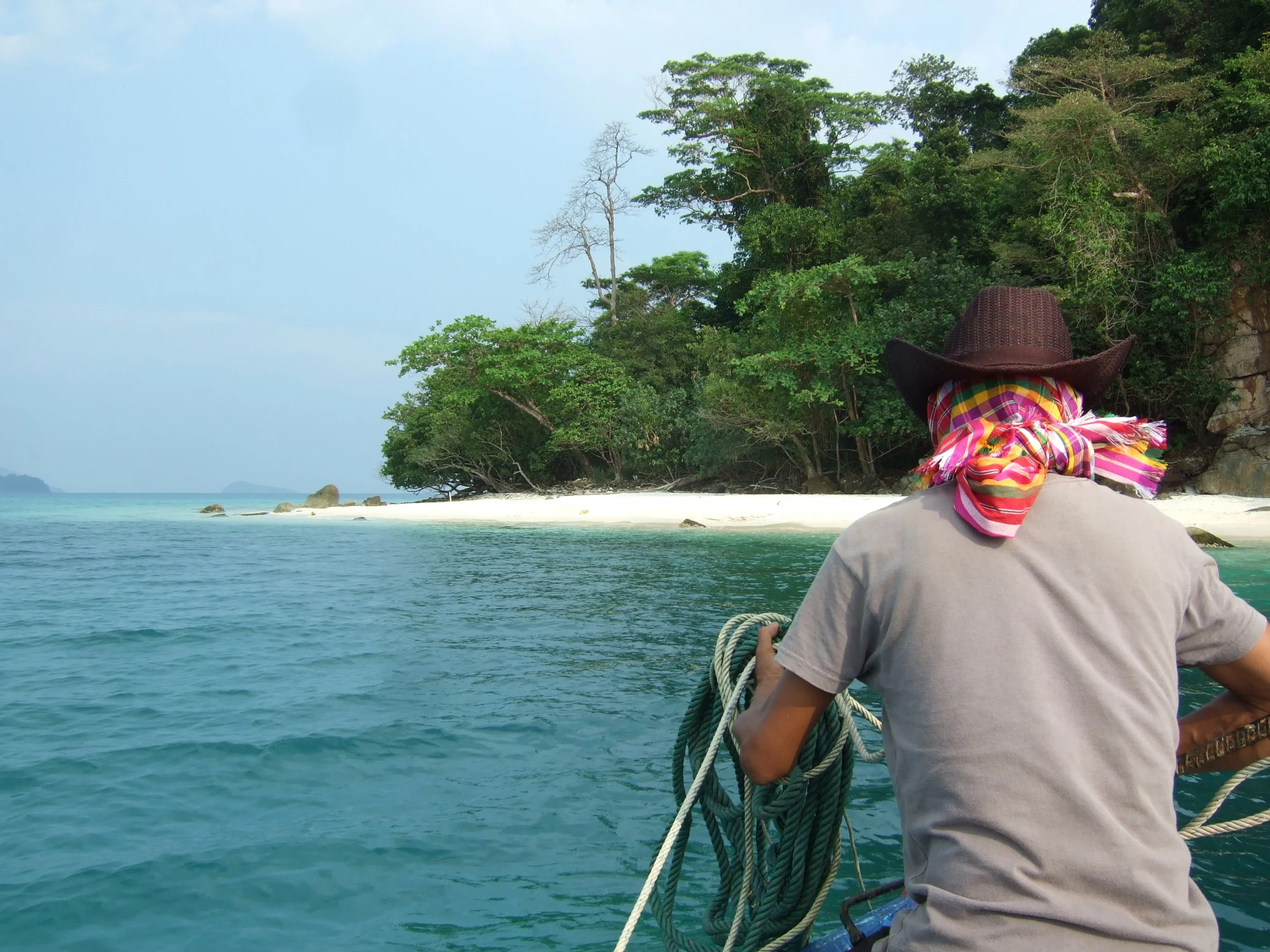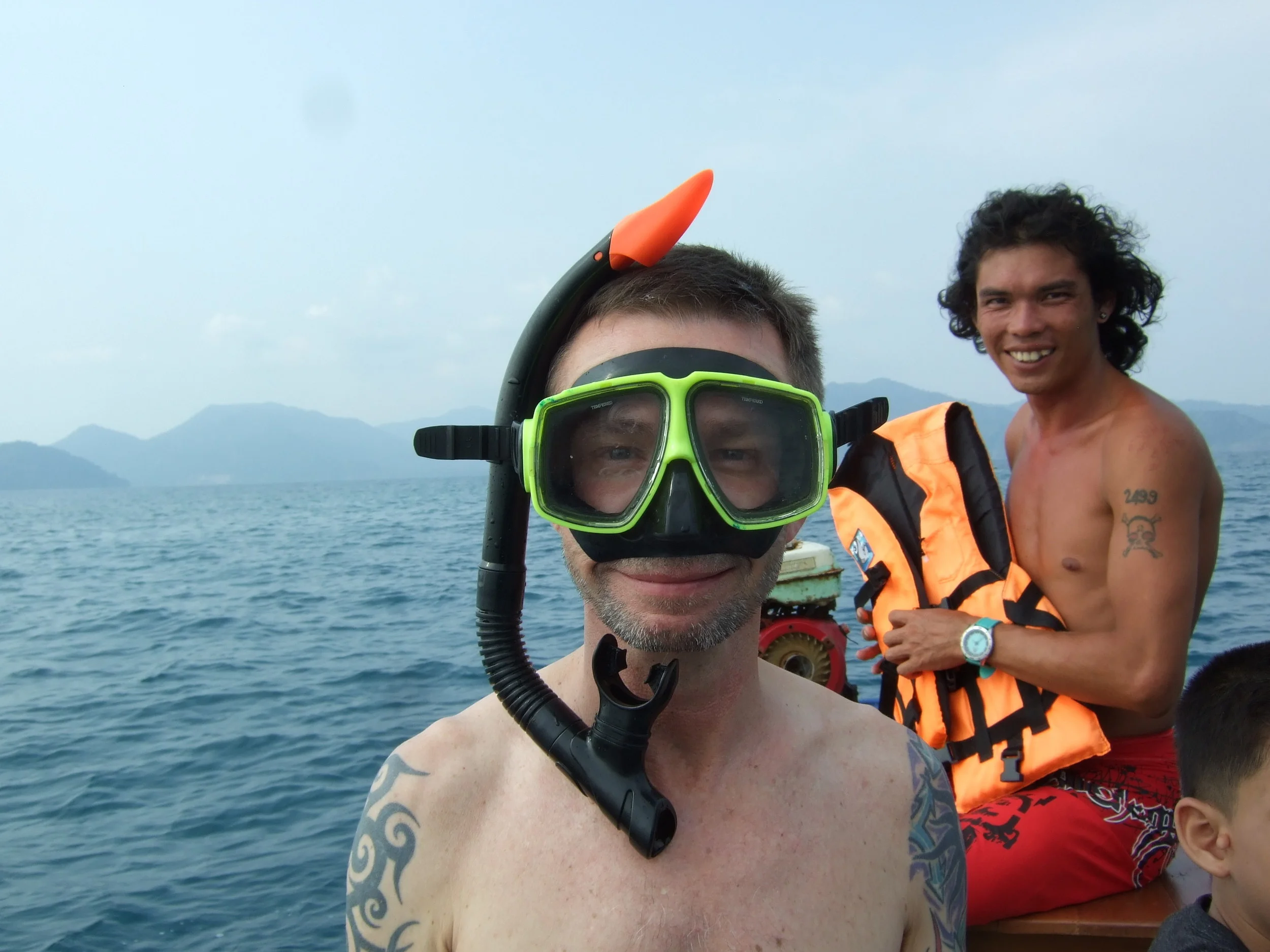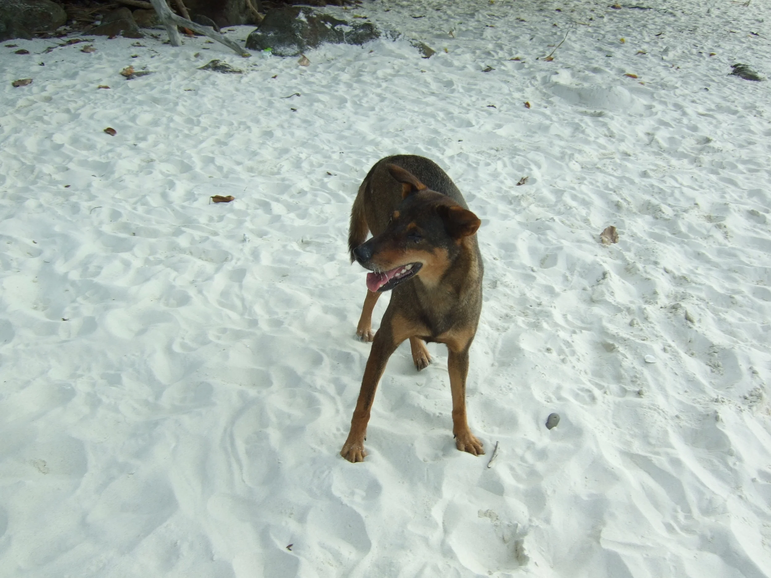 Wir lernen ein nettes deutsch-thailändisches Pärchen mit Siamkatze und dem weissen Hund im Anhang kennen. Sie leben derzeit gemeinsam am Strand und vertickern Acitivity Events an Touristen. Er nennt sich ganz bescheiden "Superman", sie (Kathi) kommt aus München, ist ernsthaft bescheiden und studiert Sonderschulpädagogik. Unser Held und Muskelmann besitzt ein Motorboot mit dem er Ausflüge auf dem Meer anbietet. Das nehmen wir gerne auf und fahren ein paar Stunden zur See, schnorcheln und besuchen eine einsame Insel mit Traumstrand. Trauriger Höhepunkt ist die Begegnung mit dem einsamen Hund, der hier ausgesetzt wurde. Er ist einziger Bewohner und völlig darauf angewiesen, dass die Tagestouristen bzw. Bootsführer Essensreste für ihn dalassen. Hmm, das riecht mir nach Rettungsaktion. Wenigstens habe ich versucht was ins Rollen zu bringen damit es dem Burschen besser geht...