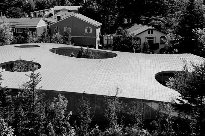 Teil 2 ist einfach nur das Beste was die Zeit bieten kann: ein Museum in der Stadt Karuizawa, ausschliesslich einem einzelnen Künstler, dem Maler Hiroshi Senju gewidmet, dessen Wasserfälle in Japan angehimmelt werden. Das im Netz geklaute Bild aus der Vogelperspektive zeigt die Konstruktion des Daches; wie ein Blatt Papier im Wind legt es sich über den Hang. Der weisse Raum im Inneren wirkt keinesfalls klinisch und hart wie ein Badezimmer. Im Gegenteil, es fühlt sich ganz weich an. Auch bei diesem Gebäude ist der Bezug zur Natur relevant. Wie Landschaft und Architektur verschmelzen können, kann man am eigenen Leib verspüren wenn man das Glück hat durch Japan reisen zu dürfen ...